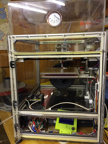 Die leichte Modifizierung erfolgte bei der Rahmengröße um einen geschlossenen Druckraum (erforderlich für ABS-Drucke) zu erhalten und um alle Komponenten (Netzteil, Steuerung, PC) in einem Gehäuse unter zu bringen. Auf