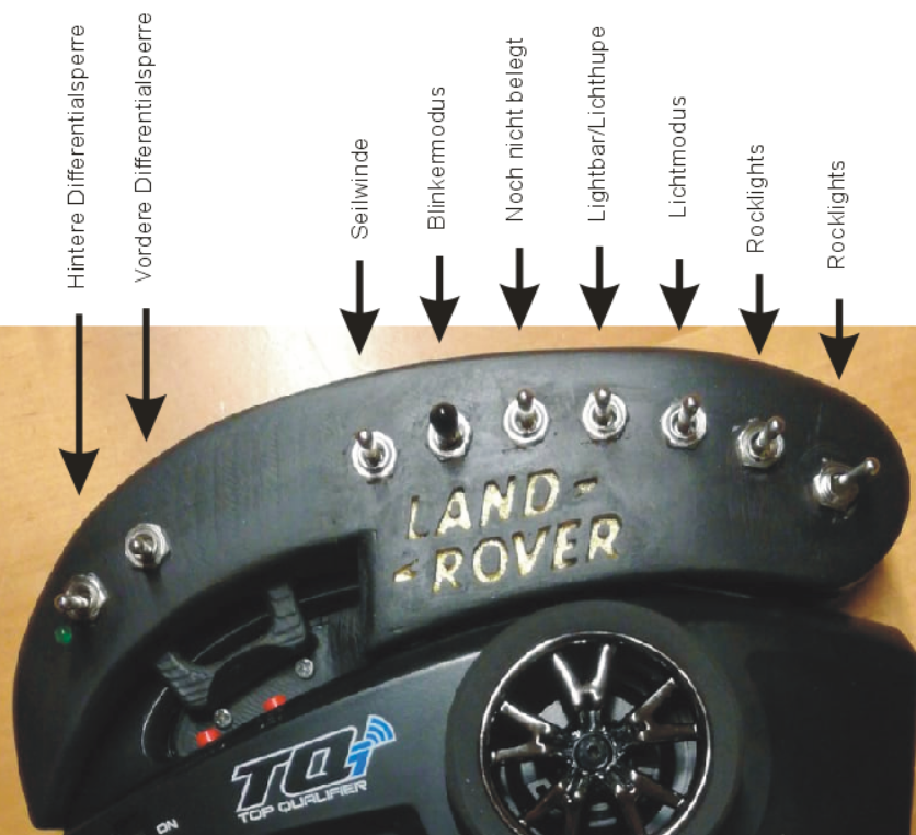 Nach Erst-Inbetriebnahme der Anlage stellte sich aber nun heraus, dass alle Kanäle des Senders bereits durch die normalen, erweiterten Fahrfunktionen (inkl. Der beiden Differentialsperren-Servos und des Servos zum Umschalten der beiden Geschwindigkeitsstufen) vollständig ausgenutzt waren. Vorhandene Erweiterungssets wie Lichtmodule oder die Ansteuerung einer nachrüstbaren, funktionsfähigen Winde verfügen dann zumeist über ihre eigenen kleine Fernbedienungen. Alternativ könnte man natürlich auch einen „historischen“ Weg gehen und das Licht durch einen Zweikanalschalter einschalten, der parallel zum Lenkservo angeschlossen werden würde. Eine z.B. zweimalige schnelle Lenkbewegung nach Rechts würde das Licht ein- und auch wieder ausschalten. Das wäre aber nur die allerletzte Option gewesen - ein Multiswitchsystem ist hier natürlich wesentlich komfortabler.